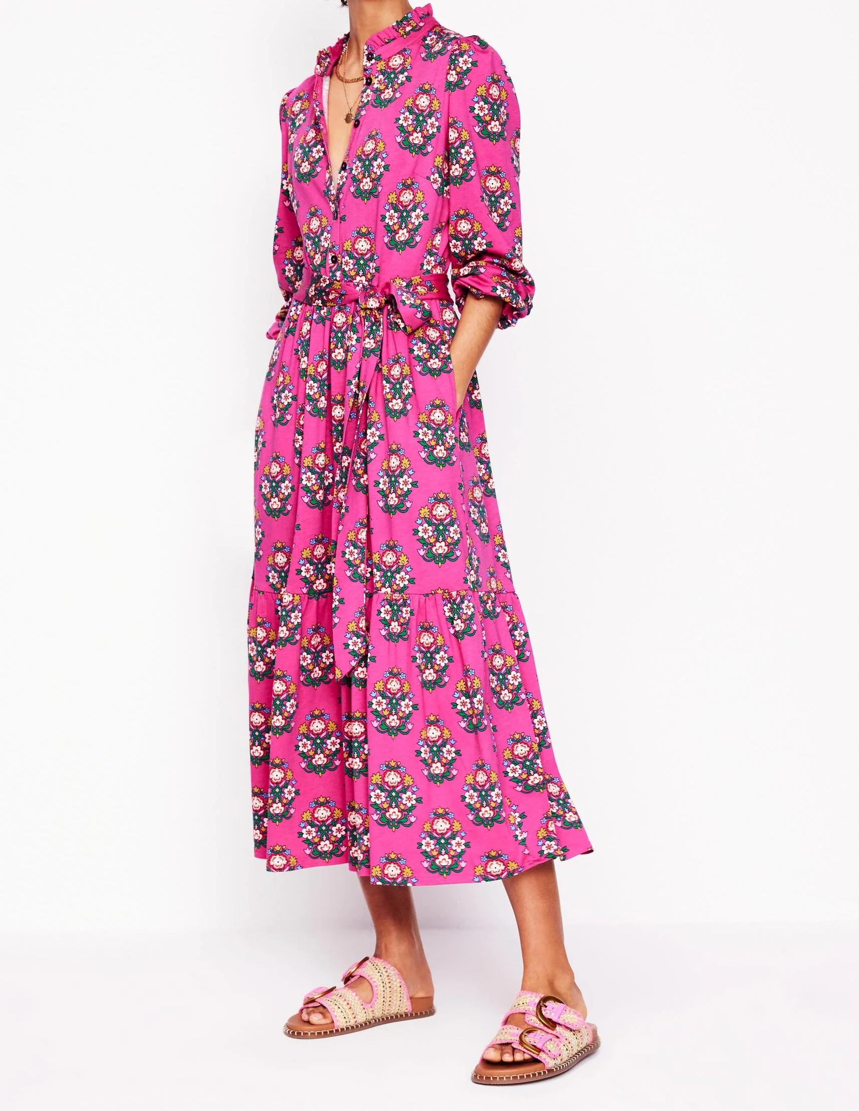 Hot Pink Floral Belted Midi Dress